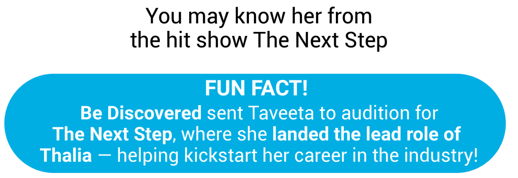 Taveeta is a dancer, actress and recording artist from Toronto. She rose to prominence playing Thalia on The Next Step, a breakthrough role that launched her career in the industry.